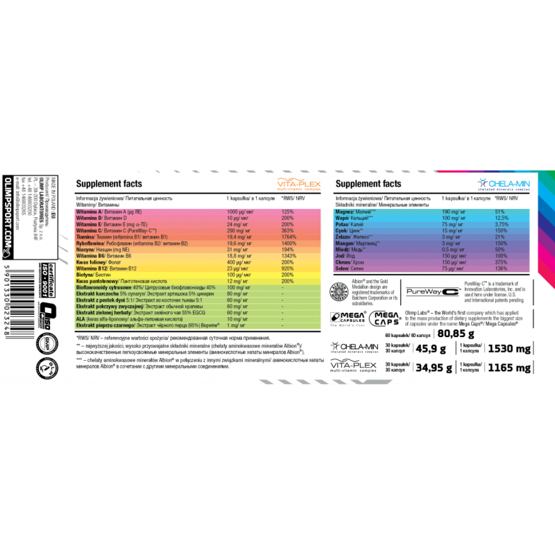 Vita-Min Multiple Sport® Mega Caps®/Mega Capsules® to preparat, który posiada w składzie:- witaminy i składniki mineralne korzystne dla zdolności wysiłkowej organizmu,- bioflawonoidy cytrusowe eliminujące wolne rodniki i wspierające antyoksydacyjne działanie witaminy C,- polifenole zielonej herbaty (w tym EGCG) o właściwościach antyoksydacyjnych, które działają korzystnie na przemianę materii oraz spalanie tkanki tłuszczowej,- cynaryny z karczocha wpływające korzystnie na czynność wątroby oraz umożliwiające odpowiedni wykorzystanie z składników budulcowych i energetycznych z jedzenia,- polifenole i fitoestrole z dyni i pokrzywy wspierające pracę układu hormonalnego związane z adaptacją organizmu do wysiłku- kwas alfa liponowy (ALA) wykazujący działanie korzystne dla wątroby, a także wspomagający wnikanie składników energetycznych do mięśni i zachodzących w nich procesów metabolicznych,- piperynę (Biopiperyne®) z czarnego pieprzu, która stymuluje wchłanianie składników pokarmowych z układu trawienia, w tym wszystkich zawartych w preparacie Vita-Min Multiple Sport®.