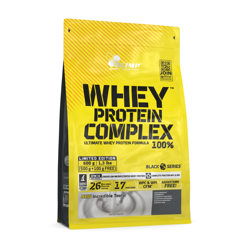 Olimp Whey Protein Complex 100%® to kompozycja wysokiej jakości ultrafiltrowanego koncentratu białek serwatkowych WPC oraz izolatu białek serwatkowych WPI-CFM® zachowanych w formie instant.Izolat białek serwatkowych CFM® oraz koncentrat białek serwatkowych WPC zastosowane w Whey Protein Complex 100%® 500G + 100G charakteryzuje wysoka wartość odżywcza. Pozyskiwane są w zaawansowanych procesach technologicznych, stąd zachowują pełną strukturę oraz aktywność funkcjonalnych białek serwatkowych. Pełnowartościowe izolowane i koncentrowane białka są również najbardziej wartościowym źródłem protein dla sportowców wyczynowych oraz osób aktywnych fizycznie.Odżywka białkowa Whey Protein Complex 100%® przyczynia się do wzrostu lub utrzymania prawidłowej masy mięśniowej.
