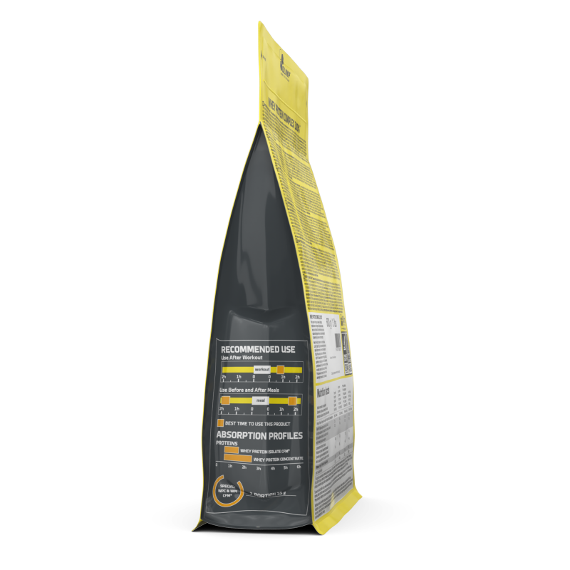Skład: 95% preparaty białkowe (ultrafiltrowany koncentrat białek serwatkowych WPC (z mleka), izolat białek serwatkowych WPI-CFM® (z mleka)), aromaty, mąka z orzeszków ziemnych (arachidowych) (dla smaku Masła Orzechowego), olej ze średniołańcuchowymi kwasami tłuszczowymi (olej MCT), fruktoza, regulatory kwasowości – kwas jabłkowy, kwas cytrynowy, cytryniany sodu; substancje zagęszczające – guma arabska, guma ksantanowa, sól sodowa karboksymetylocelulozy; substancje słodzące – acesulfam K, sukraloza, cyklaminiany (Z); emulgator – lecytyny (z soi); sól, barwniki: karoteny (A), koszenila (B), ryboflawiny (C), E 150c (D), E 150d (E), E 133 (F), błękit patentowy V (G), indygokarmin (H), chlorofile i chlorofiliny (I), kurkumina (J), antocyjany (K), ekstrakt z papryki (L), betanina (M), węgiel roślinny (N). (A)-(Z) – W zależności od smaku produktu symbol (A-Z) użytego składnika znajduje się obok daty minimalnej trwałości (najlepiej spożyć przed). Wyprodukowano w zakładzie wykorzystującym składniki pochodzące z mleka, jaj, soi, orzechów, orzeszków ziemnych (arachidowych), zbóż zawierających gluten, ryb, skorupiaków, mięczaków.