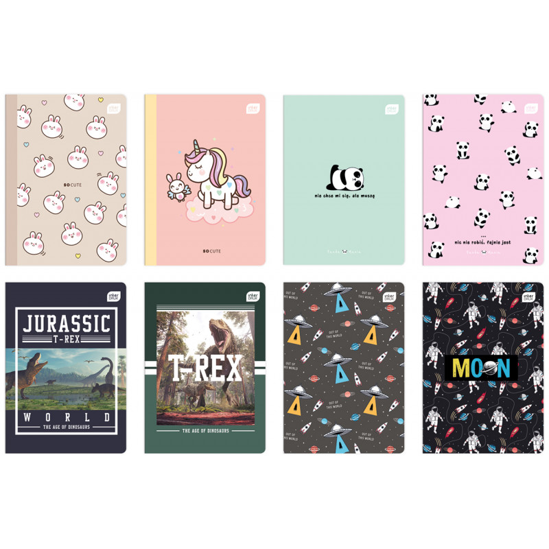 Okładka pokryta lakierem UV. Zaokrąglone rogi. Duża różnorodność wzorów, dopasowana do grup docelowych. Zeszyty w intensywnych kolorystycznie grafikach, zaprojektowane zgodnie z aktualnymi trendami w designie i modzie tak, aby sprostać wysokim oczekiwaniom każdego ucznia. Wysokiej jakości okładka zabezpieczona błyszczącym lakierem ochroni wszystkie ważne notatki.