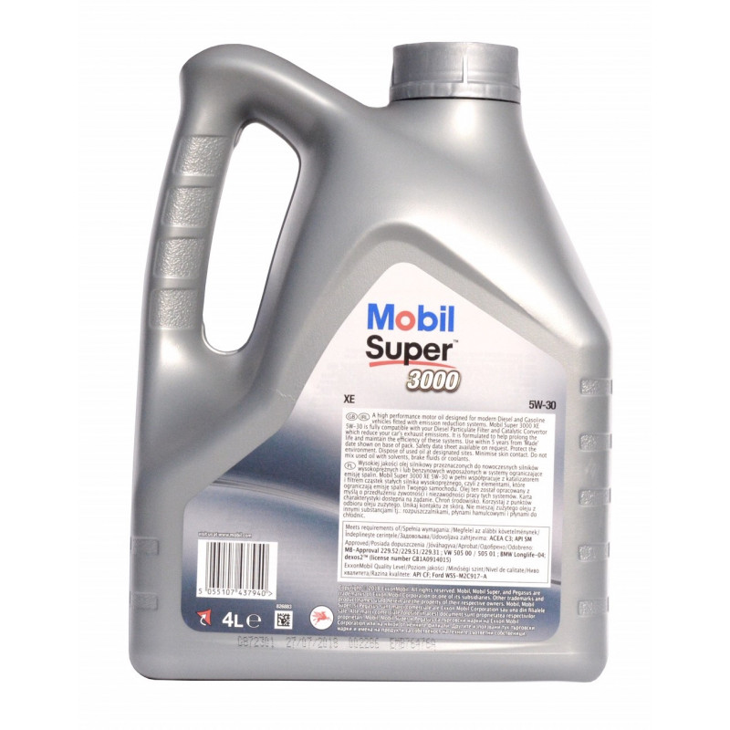 Mobil Super 3000 xe 5w-30 jest syntetycznym, wysokowydajnym i nisko-popiołowym olejem silnikowym opracowanym z myślą o przedłużeniu żywotności i utrzymaniu wydajności systemu redukcji emisji spalin w pojazdach napędzanych zarówno benzyną jak i olejem napędowym. Przyczynia się do utrzymania wydajności systemu redukcji emisji spalin. Mobil super 3000 xe 5w-30 jest szczegónie zalecany do użytku w pojazdach marki Mercedes-Benz (dla których wymagane jest dopuszczenie MB 229.31 lub 229.51), w pojazdach marki BMW (w których wymagany jest olej longlife oil 04) jak również w pojazdach marki Volkswagen (dla których wymagane jest dopuszczenie VW 502 00 / 505 00). Mobil super 3000 xe 5w-30 jest również przeznaczony do użytku w silnikach tdi volkswagena z pompowtryskiwaczami; (przerwy międzyserwisowe: 15000 km / 1 rok), dla których wymagane jest dopuszczenie VW 505 01 oraz w silnikach dla forda galaxy 1,9l turbo diesel. Które wymagają dopuszczenia VW 505 01 lub Ford wss-m2c917-a.Mobil super 3000 xe 5w-30 posiada dopuszczenie general motors service fill dexos2, które jest wymagane dla wszystkich nowych modeli 2010 gm/opel/vauxhall/chevrolet z silnikami diesla oraz benzynowymi. Producenci gm/opel zalecają stosowanie specyfikacji dexos2 jako kompatybilnej ze starszymi specyfikacjami gm/opel (gm-ll-a-025 oraz gm-b-ll-025). Oleje spełniające wymogi dexos2 mogą być stosowane w większości pojazdów gm/opel/vauxhall/chevrolet z silnikami na paliwo diesla jak i na benzynę. Mobil super 3000 xe 5w-30 spełnia lub przewyższa następujące wymagania: ACEA C3 API SM/SL. Mobil super 3000 xe 5w-30 posiada następujące aprobaty producentów: General Motors service fill dexos2 (license number gb1a0914015) BMW longlife 04, dopuszczenie MB 229.31/229.51volkswagen (benzyna / diesel) 502 00 / 505 00 / 505 01
