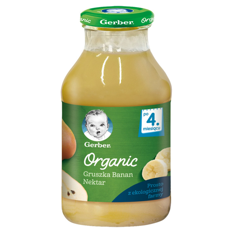 Nektar dla maluszków po 4. miesiącu, który powstał z połączenia soczystych gruszek i łagodnych bananów. Owoce wyrosły w gospodarstwach ekologicznych, a ich organiczne pochodzenie potwierdza odnawiany co roku certyfikat. Produkt nie zawiera dodatku cukru - tylko cukry naturalnie pochodzące ze składników: bananów i gruszek. Dostarcza dziecku witaminę C i błonnik.