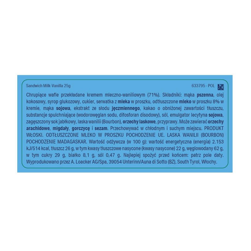 Loacker Sandwich to niezwykle poręczna i elegancka forma wafli. Małe, kieszonkowe, praktyczne opakowanie skrywa całe dobro 9 znakomitych wafelków. To idealny pomysł na lekką, chrupiącą przekąskę, którą warto mieć zawsze pod ręką. W plecaku czy torebce, w szkole czy w pracy? To od Ciebie zależy gdzie będziesz delektować się ich niezwykłym smakiem i chrupkością.Ciesz się smakiem znakomitych wafelków z włoskich Dolomitów Bez oleju palmowego, Bez barwników, Bez aromatów, Bez konserwantów, Bez tłuszczów utwardzonych