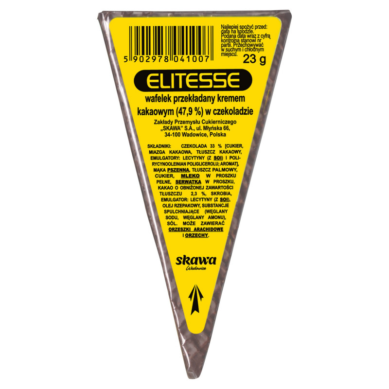 Trójkątny, kruchy wafelek obficie oblany czekoladą, o niepowtarzalnym kształcie, idealnie nadający się jako dodatek do kawy lub przekąska w drodze do pracy.