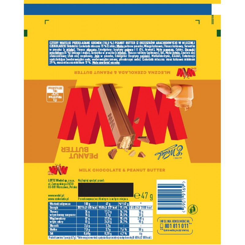 Czekolada mleczna 73% (Cukier, Mleko pełne w proszku, Miazga kakaowa, Tłuszcz kakaowy, Serwatka w proszku (z mleka), Tłuszcz mleczny, Emulgatory: lecytyny sojowe i E 476, Aromat), Mąka pszenna, Cukier, Orzeszki arachidowe (5%) (miazga i mąka), Serwatka w proszku (z mleka), Tłuszcz roślinny (palmowy), Sól, Mąka żytnia, Zawiera olej słonecznikowy i/lub olej rzepakowy, Jaja w proszku, Emulgator (lecytyny sojowe), Maltodekstryna, Aromat, Substancje spulchniające (wodorowęglan sodu, wodorowęglan amonu, pirosiarczyn sodu). Czekolada mleczna: masa kakaowa minimum 29%, masa mleczna minimum 17%. Może zawierać orzechy.