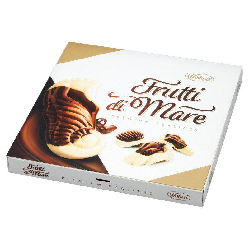 Praliny z białej czekolady (34%) i czekolady (9%) nadziewane kremem (57%) o smaku karmelowym, orzechowym, mlecznym i kakaowym.