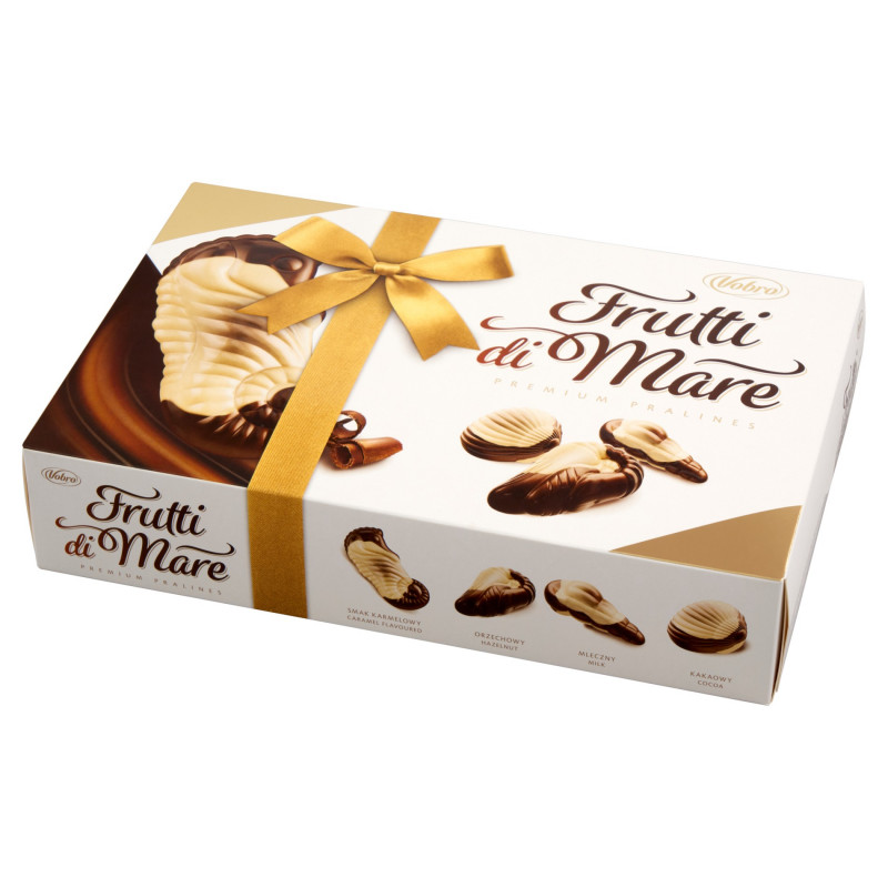 Praliny z czekolady (34 %) i białej czekolady (9 %) nadziewane kremem (57 %) o smaku karmelowym, orzechowym, mlecznym i kakaowym.