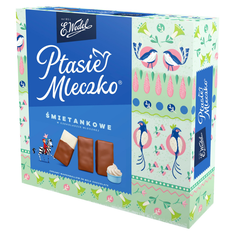 Co wyróżnia Ptasie Mleczko® spośród innych słodkości? Przede wszystkim charakterystyczny kształt kostki, który kusi do sięgnięcia po kolejną i kolejną, i jeszcze jedną piankę. Już jeden kęs wystarczy, by poczuć mocno czekoladowy smak wedlowskiej czekolady mlecznej i wgryźć się w śmietankowe pianki. Ale... pamiętaj, że Ptasie Mleczko® najlepiej smakuje w towarzystwie, więc podziel się nim lub sprezentuj komuś bliskiemu.