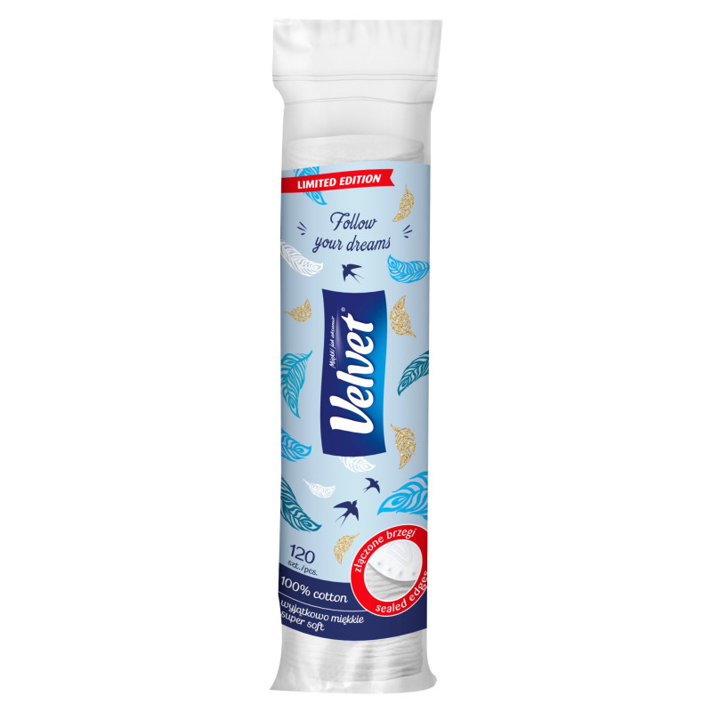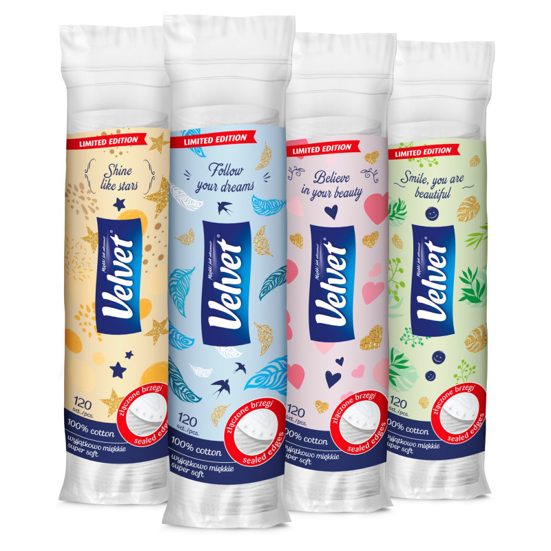 Płatki kosmetyczne 120 sztuk Velvet to płatki wykonane ze 100 % bawełny, które zamknięto w kolorowych opakowaniach z sentencjami. Każda paczuszka zawiera 120 miękkich, delikatnych i okrągłych płatków kosmetycznych z charakterystycznym wytłoczeniem w kształcie literki „V” na wierzchniej stronie pojedynczego wacika. To, co je wyróżnia, to idealnie złączone brzegi, które chronią produkt przed rozwarstwianiem podczas codziennych zabiegów kosmetycznych oraz zapobiegają pozostawianiu na skórze uciążliwych „kłaczków”. Produkt został przebadany dermatologicznie.