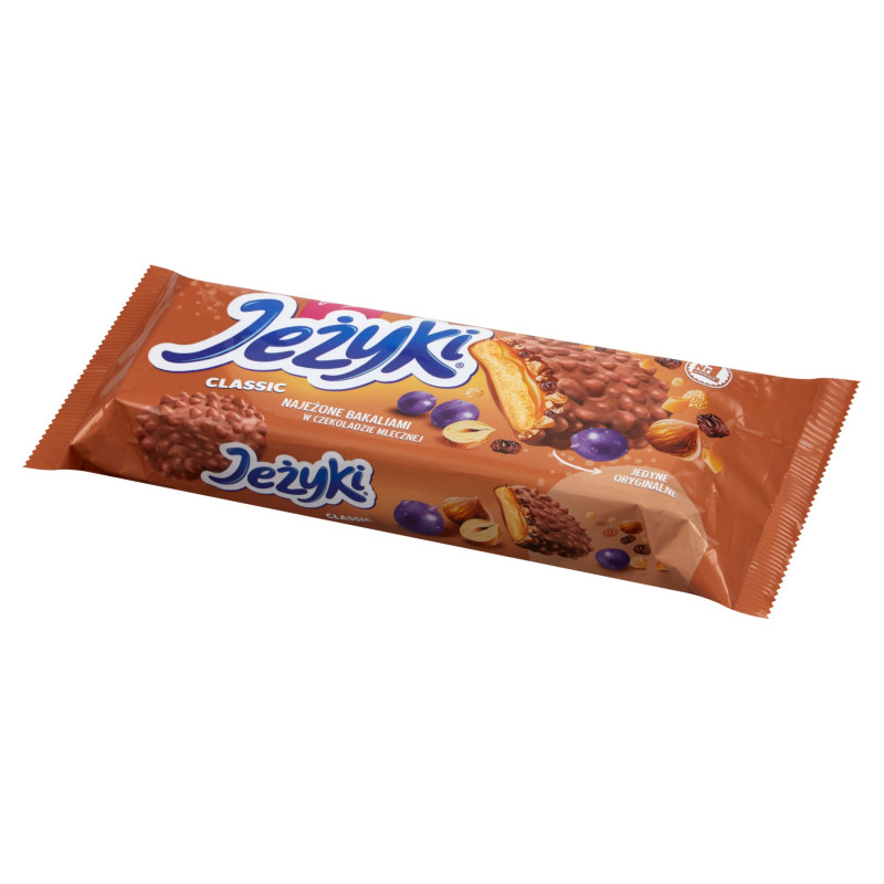 Herbatniki z karmelem 32,3 %, orzechami laskowymi, rodzynkami i chrupkami ryżowymi w czekoladzie mlecznej.