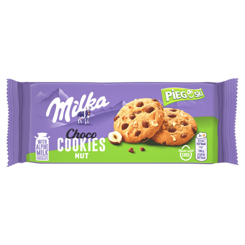 Milka Pieguski Choco Nut to klasyczne ciastka z kawałkami mlecznej czekolady Milka z alpejskiego mleka i chrupiącymi orzechami laskowymi. Opakowanie 135 g - idealne do dzielenia się z bliskimi.