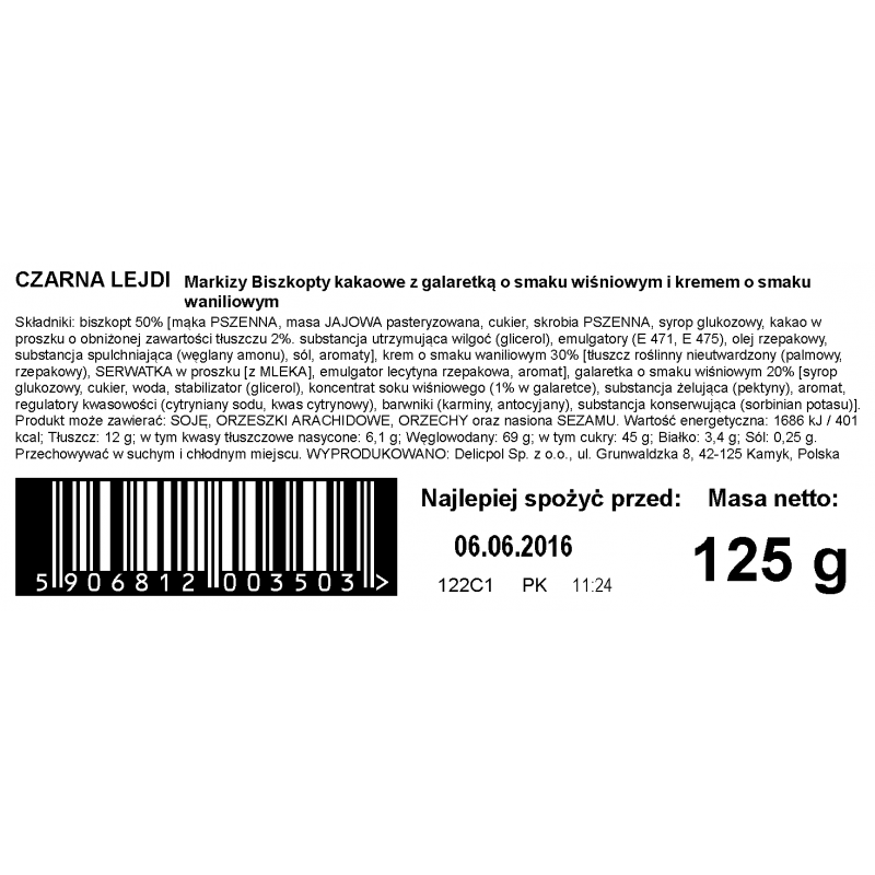 Składniki: Składniki: biszkopt 50% [mąka PSZENNA, masa JAJOWA pasteryzowana, cukier, skrobia PSZENNA, syrop glukozowy, kakao w proszku o obniżonej zawartości tłuszczu 2%. substancja utrzymująca wilgoć (glicerol), emulgatory (E 471, E 475), olej rzepakowy, substancja spulchniająca (węglany amonu), sól, aromaty], krem o smaku waniliowym 30% [tłuszcz roślinny nieutwardzony (palmowy, rzepakowy), SERWATKA w proszku [z MLEKA], emulgator lecytyna rzepakowa, aromat], galaretka o smaku wiśniowym 20% [syrop glukozowy, cukier, woda, stabilizator (glicerol), koncentrat soku wiśniowego (1% w galaretce), substancja żelująca (pektyny), aromat, regulatory kwasowości (cytryniany sodu, kwas cytrynowy), barwniki (karminy, antocyjany), substancja konserwująca (sorbinian potasu)]. Produkt może zawierać SOJĘ, ORZESZKI ARACHIDOWE, ORZECHY i nasiona SEZAMU.