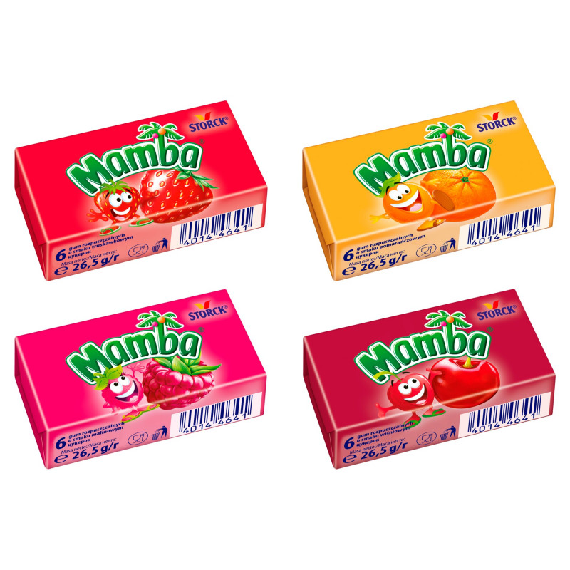 Mamba to rozpuszczalne gumy owocowe w 4 pysznych smakach: truskawkowym, malinowym, pomarańczowym i wiśniowym. Nowa receptura nadaje wyjątkową gładkość, elastyczność i miękkość kostce przy zachowaniu doskonale znanych smaków.