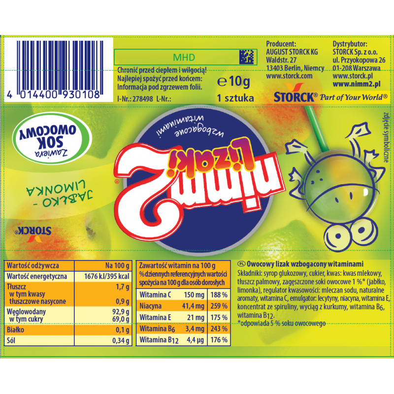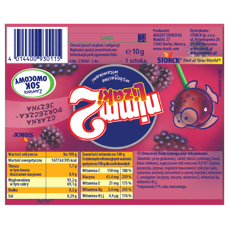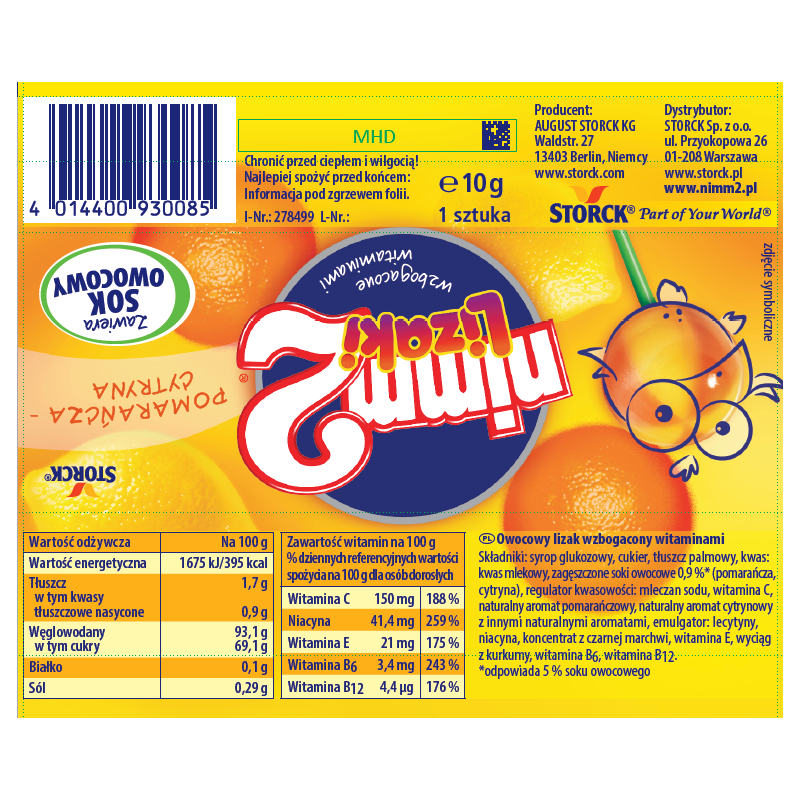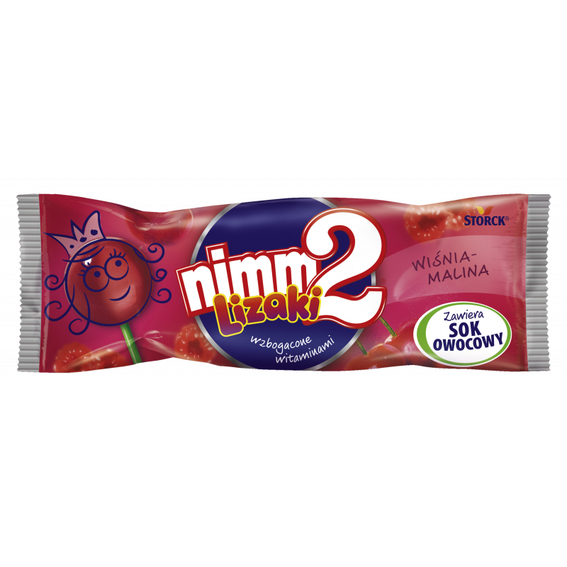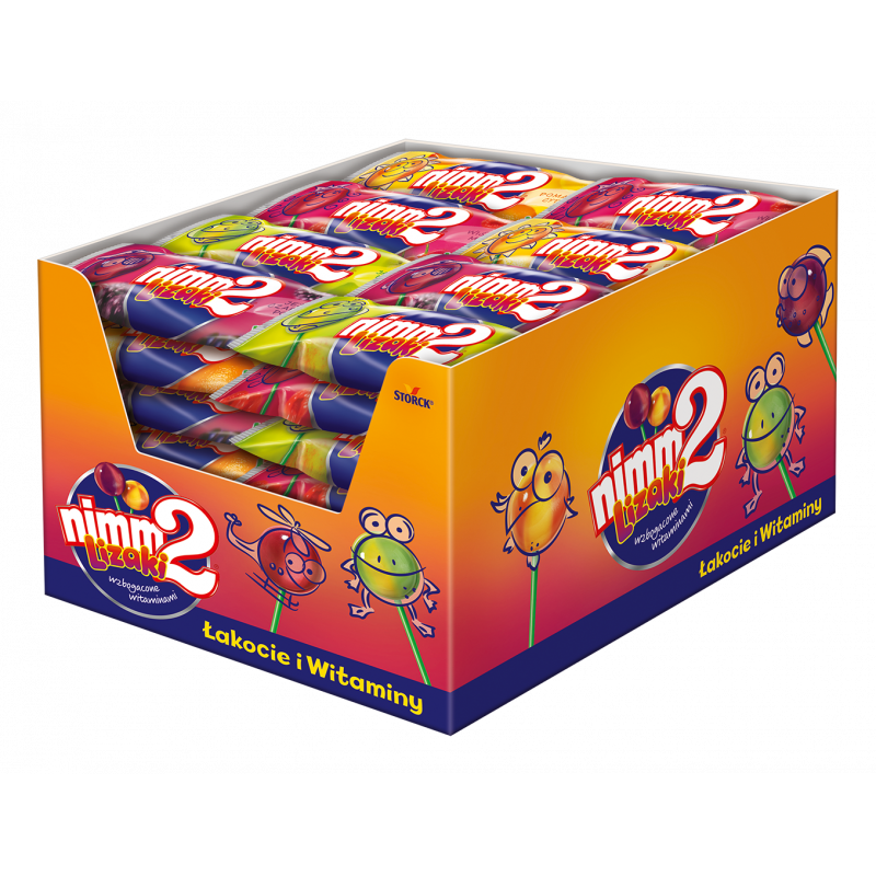 Nimm2 lizaki to prawdziwa przyjemność!Zawierają sok owocowy oraz są wzbogacone witaminami. Idealnie gładkie i wyjątkowo soczyste.W czterech pysznych, podwójnie owocowych smakach: pomarańczowo-cytrynowym, jabłkowo-limonkowym, jeżynowo-porzeczkowym i wiśniowo-malinowym.