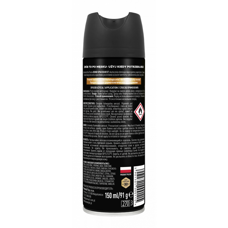 Dezodorant Bond dla Panów o orzeźwiającym zapachu, łączącym nuty drzewno-aromatyczne, zapewnia długotrwałe uczucie komfortu. Zawiera wielofunkcyjny, nowoczesny składnik dezodorujący, redukujący zapach potu.