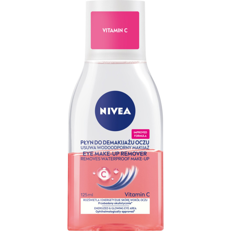 NIVEA Pielęgnujący dwufazowy płyn do demakijażu oczu skutecznie usuwa nawet bardzo trwały tusz do rzęs, bez konieczności uporczywego pocierania powiek, usuwa również wodoodporny makijaż. Płyn skutecznie i delikatnie oczyszcza wrażliwą skórę wokół oczu. Formuła płynu wzbogacona została Witaminą C, dzięki czemu rozświetla i pobudza skórę wokół oczu. Mogą go stosować również osoby noszące soczewki. Produkt nie pozostawia nieprzyjemnej, tłustej warstwy na skórze. Jego tolerancja dla skóry i oczu została przebadana dermatologicznie i okulistycznie. Produkt nadaje się do wszystkich typów skóry. Wegańska formuła - bez składników pochodzenia zwierzęcego Butelka w 96% pochodzi z recyklingu - bez etykiet, zatyczki i nakrętki. NIVEA® - ponad 100 lat doświadczenia w pielęgnacji skóry oraz starannie wyselekcjonowane składniki z zachowaniem najwyższych standardów jakości.