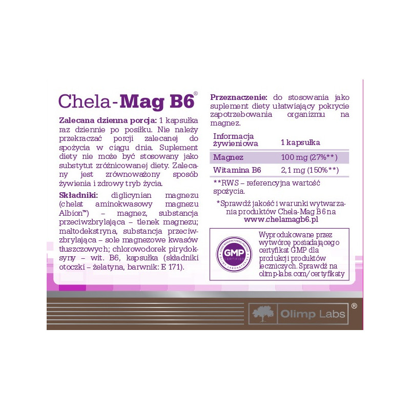 Preparat posiada pozytywną opinię Instytutu Matki i Dziecka.Suplement diety zawierający magnez w formie hipoalergicznego, chelatu aminokwasowego ALBION® (diglicynian magnezu), wzbogacony witaminą B6:Badania naukowe udowodniły, że magnez:pomaga w prawidłowym funkcjonowaniu mięśni; przyczynia się do prawidłowego funkcjonowania układu nerwowego, uczestniczy w utrzymaniu prawidłowych funkcji psychologicznych, przyczynia się do zmniejszenia uczucia zmęczenia i znużenia; uczestniczy w utrzymaniu zdrowych kości i zębów; bierze udział w utrzymaniu równowagi elektrolitowej; zaangażowany jest w prawidłowy metabolizm energetyczny oraz pomaga w prawidłowej syntezie białek. Właściwą absorpcję magnezu z przewodu pokarmowego i jego dystrybucję w obrębie organizmu zapewnia fakt, iż występuje on w postaci wysokiej jakości chelatu aminokwasowego charakteryzującego się niezwykle wysoką biodostępnością.Chelat aminokwasowy magnezu Albion® jest całkowicie hipoalergiczny (nr patentu US 7,838,042), co jest niezwykle istotne z punktu widzenia bezpieczeństwa przyjmowania preparatu.