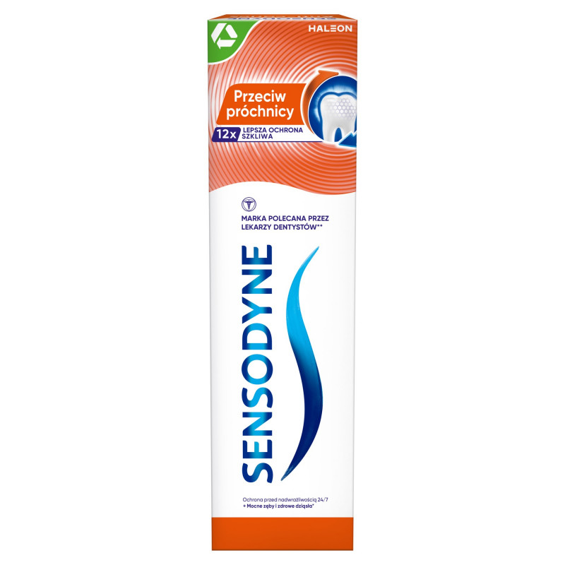 Pasta do wrażliwych zębów Sensodyne Przeciw Próchnicy z fluorem, została stworzona, by łagodzić skutki nadwrażliwości zębów i w ten sposób chronić je przed rozwojem próchnicy. Pasta działa wewnątrz zębów, łagodząco na zakończenia nerwowe zębów. Jej specjalna formuła zawiera łagodzący nadwrażliwość zębów azotan potasu oraz fluorek, który wzmacnia szkliwo, sprzyjając jego remineralizacji. Dzięki temu pasta nie dopuszcza do rozwoju bakterii tworzących płytkę nazębną i produkujących kwasy osłabiające szkliwo, co może dalej prowadzić do rozwoju próchnicy. Aktywnie wzmacnia zęby, a także usuwa kamień nazębny, dbając o zdrowie dziąseł. Przy regularnym szczotkowaniu dwa razy dziennie Sensodyne Przeciw Próchnicy zapewnia całodobową ochronę przed nadwrażliwością.