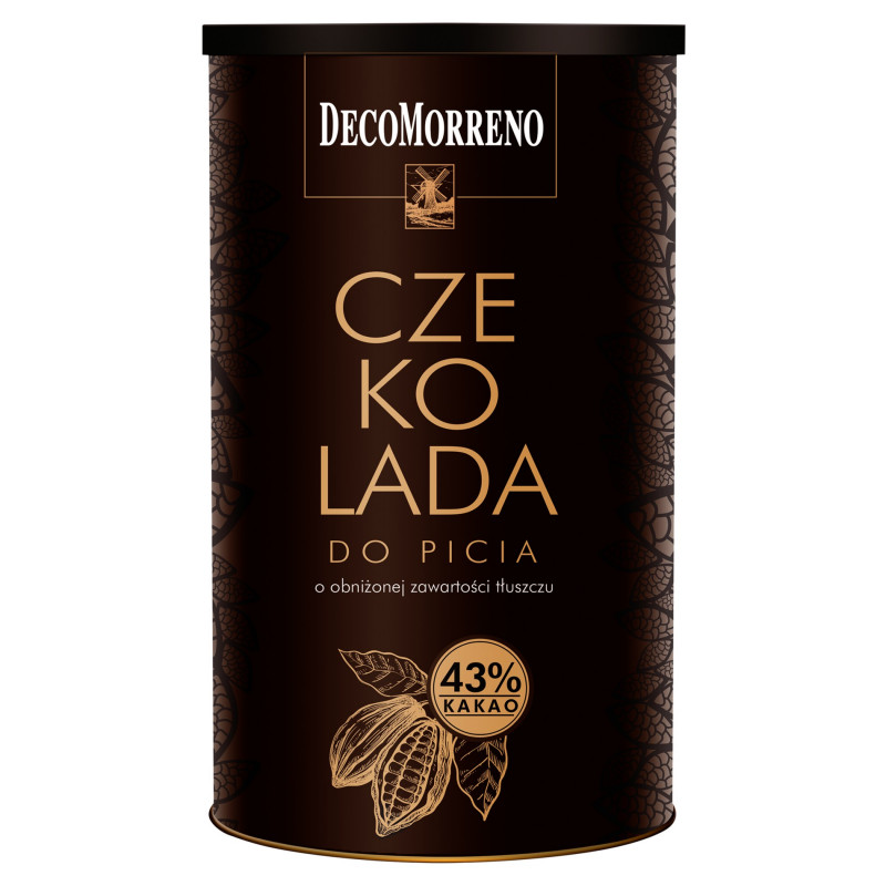 Sposób przygotowania: wsypać 4 łyżeczki (15 g) czekolady DecoMorreno do kubka, zalać gorącym, lecz nie gotującym się mlekiem (150 ml), zamieszać i gotowe.