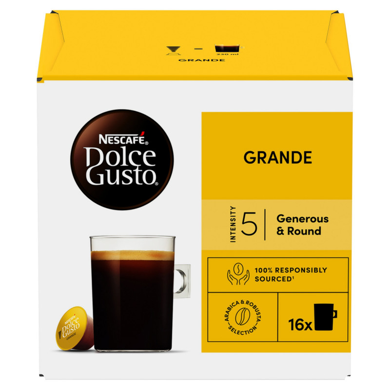 • Opakowanie zawiera 16 kapsułek z kawą NESCAFÉ® Dolce Gusto® Grande, które są kompatybilne z ekspresami kapsułkowymi NESCAFÉ® Dolce Gusto®.
