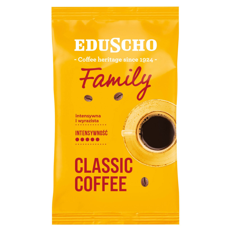 Eduscho Family to wyjątkowo aromatyczna kawa, którą znasz i kochasz. Jej bogaty i pobudzający smak zaspokoi preferencje każdego miłośnika kawy. To doskonały wybór na codzienne chwile przy kawie lub ciepłe, niezobowiązujące spotkania z rodziną i przyjaciółmi. Eksperci Eduscho starannie palą wybrane ziarna kawy, aby uzyskać bogatą i aromatyczną kawę, którą można cieszyć się w każdej filiżance.