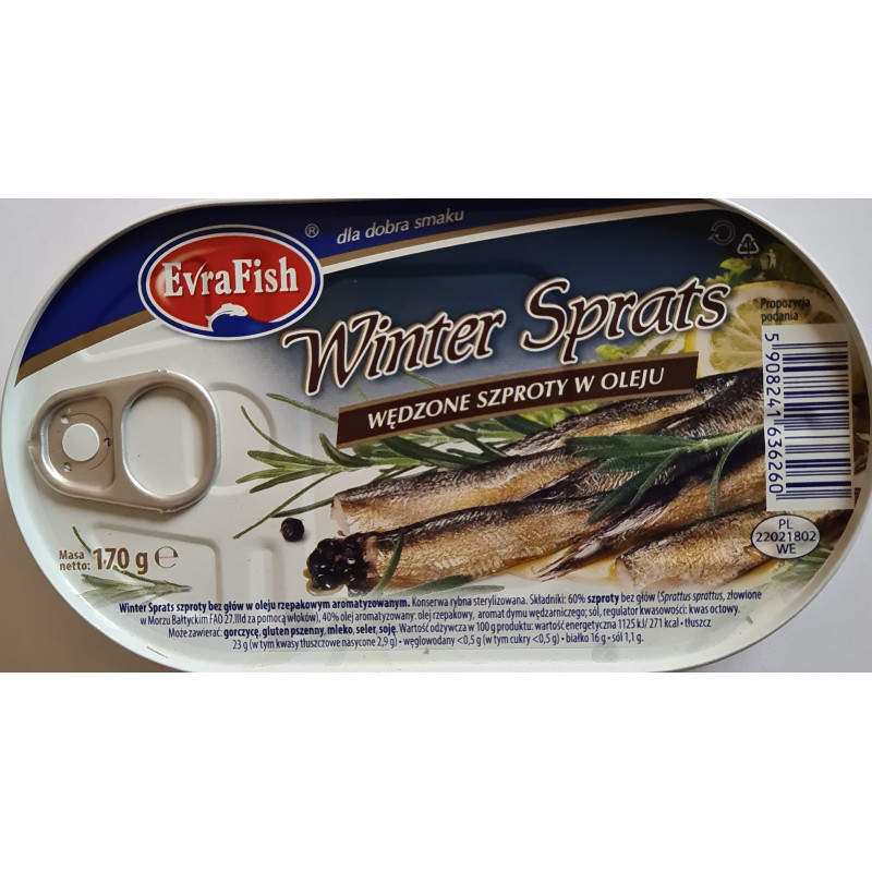 Składniki: 60% szproty bez głów (Sprattus sprattus),40% olej aromatyzowany: olej rzepakowy, aromat dymu wędzarniczego, sól, regulator kwasowości: kwas octowy.