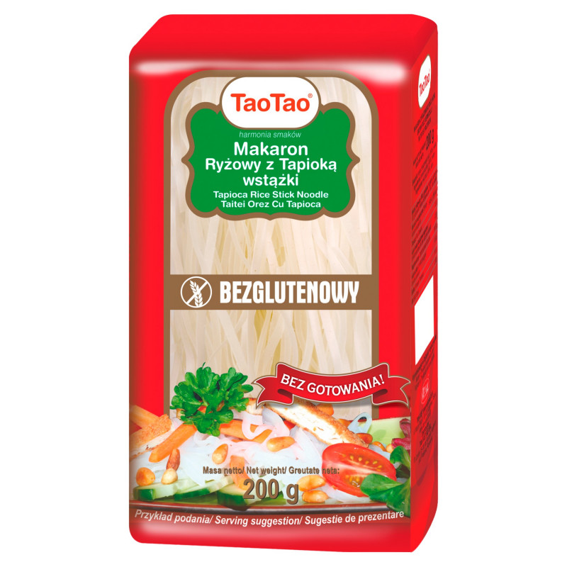 Makaron Ryżowy z Tapioką wstążki TaoTao to produkt bezglutenowy, który powstaje wyłącznie z mąki ryżowej, tapioki i wody. Makaron ryżowy z tapioką wstążki TaoTao ma delikatny smak, polecany jest do zup i sałatek. Idealnie sprawdza się jako składnik dań mięsnych i warzywnych prosto z patelni lub woka.