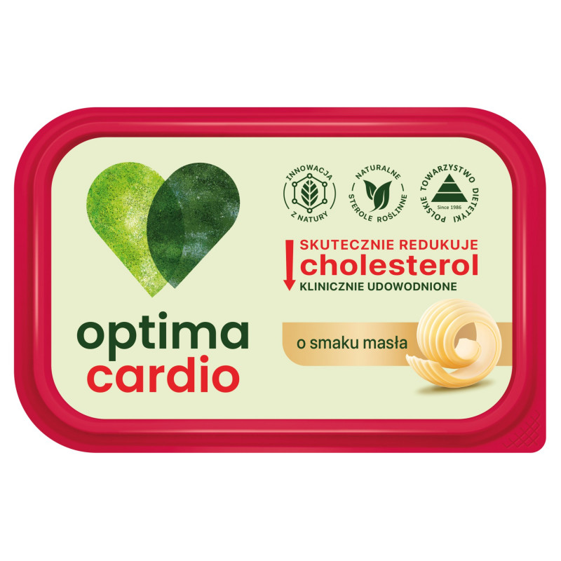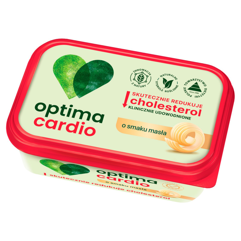 Klinicznie udowodniono, że sterole roślinne obecne w Optimie Cardio o smaku masła obniżają poziom cholesterolu we krwi. Wysoki poziom cholesterolu jest czynnikiem ryzyka rozwoju choroby wieńcowej serca. Produkt do smarowania pieczywa.