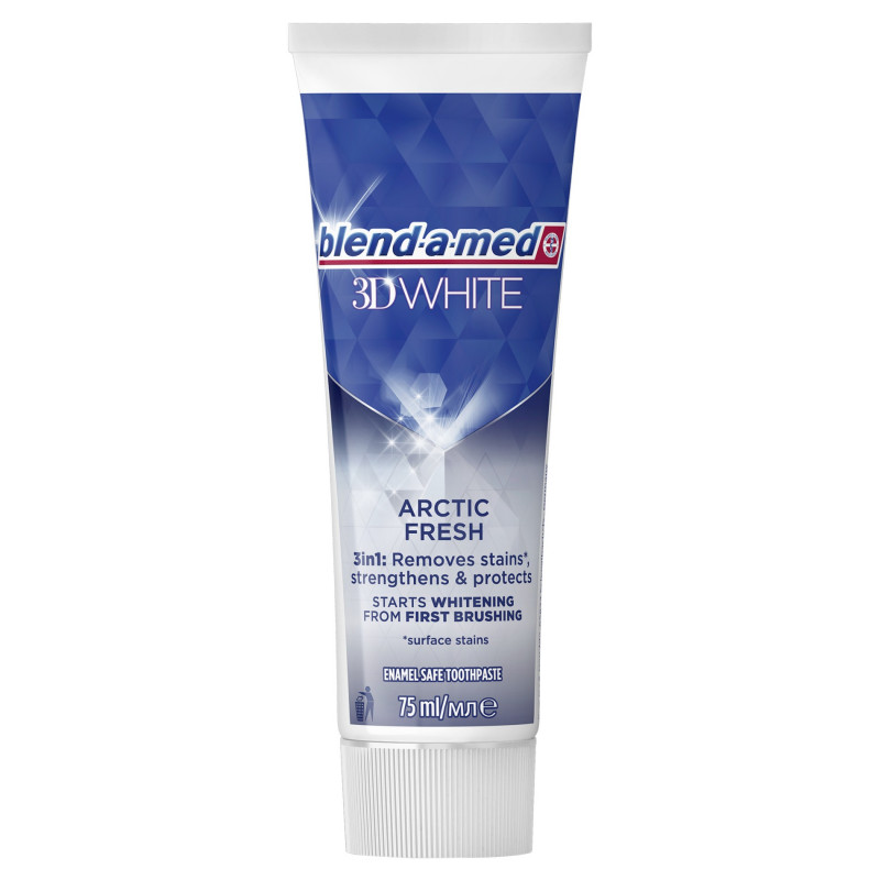 Pasta do zębów Blend-a-med 3D White Arctic Fresh ma skuteczność dowiedzioną klinicznie i zapewnia 3 działania w 1: usuwa przebarwienia powierzchniowe i zaczyna wybielać zęby już od pierwszego szczotkowania, a w dodatku wzmacnia je i chroni.