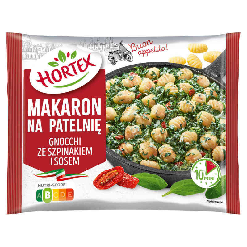 Makaron na patelnię gnocchi ze szpinakiem i sosem. Mieszanka warzyw z gnocchi ziemniaczanymi i sosem. Produkt głęboko mrożony.