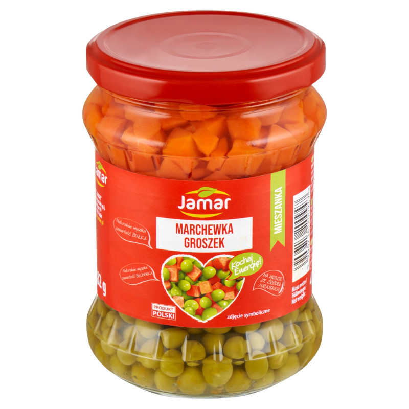 Mieszanka marchewka – groszek Jamar to kompozycja idealna. Nieco stonowany, ale głęboki smak groszku przeplata się ze świeżym i słodkim smakiem marchewki. Warzywa można wykorzystywać do dań obiadowych, jak i wszelkiego rodzaju sałatek i przekąsek. Bardzo dobra baza do wytrawnej galaretki.