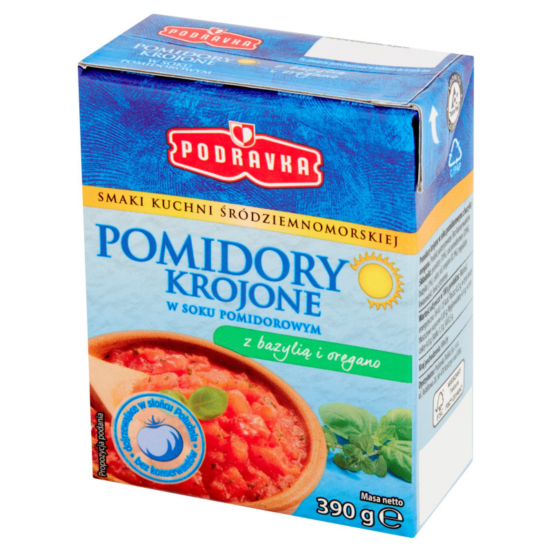 Pomidory krojone w soku pomidorowym z bazylią i oregano. Produkt pasteryzowany.
