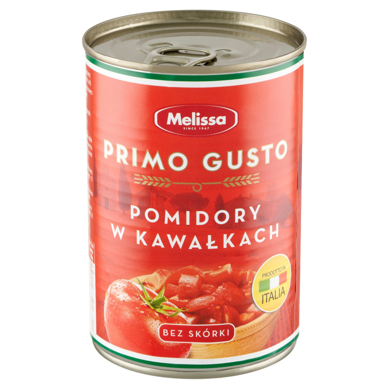 Pomidory w kawałkach bez skórki w lekko zagęszczonym soku pomidorowym.