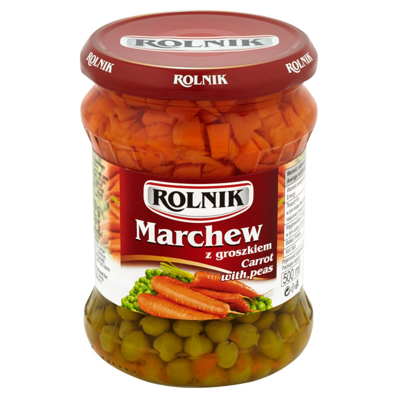 Marchew z groszkiem Rolnik to dobrze znany w polskiej kuchni, wyśmienity duet smakowy, uzyskany przez połączenie zielonego groszku i pokrojonej w drobną kostkę marchewki. Dzięki delikatnej, słodko-słonej zalewie, warzywa zyskują idealną kruchość i soczystość oraz apetyczny wygląd. Mieszankę można podawać jako dodatek do rozmaitych mięs - na zimno, zamiast tradycyjnej surówki lub na ciepło, po uduszeniu z masłem i mąką.