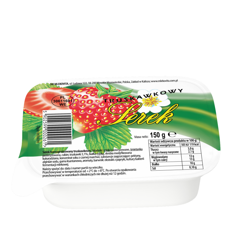 Składniki: mleko pasteryzowane, śmietanka pasteryzowana, cukier, truskawki 3,1%, białka mleka, skrobia modyfikowana kukurydziana, koncentrat soku z czarnej marchwi, substancje zagęszczające: pektyny, alginian sodu, guma ksantanowa, aromaty, barwnik: ekstrakt z papryki, kultury bakterii fermentacji mlekowej