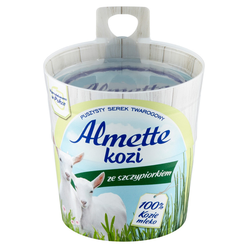 Almette kozi ze szczypiorkiem. Puszysty kozi serek twarogowy. Spulchniony azotem, pasteryzowany.