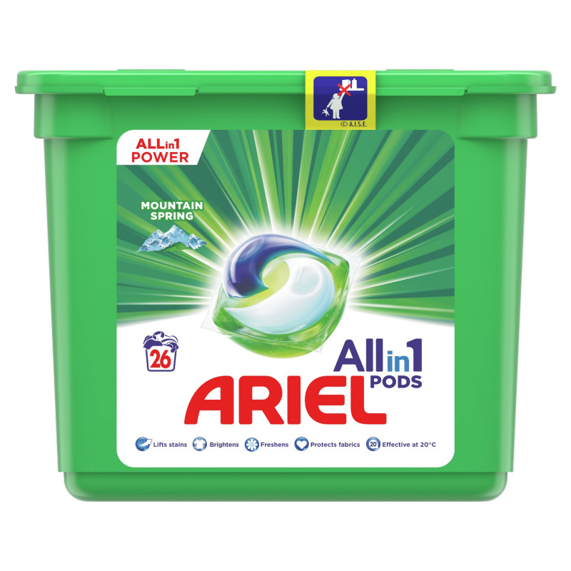 Ariel Allin1 zapewnia wyjątkową moc piorącą w jednej małej kapsułce. Kapsułki do prania Ariel Allin1 PODS Mountain Spring mają unikalną wielokomorową budowę, która sprawia, że składniki są od siebie odseparowane i nie łączą się ze sobą aż do chwili rozpoczęcia prania, dzięki czemu zapewniają wyjątkowo skoncentrowaną moc piorącą. Innowacyjna powłoka kapsułek do prania Ariel ulega całkowitemu rozpuszczeniu w kontakcie z wodą, uwalniając specjalne formuły, które pozwalają usuwać wiele różnych rodzajów plam. Kapsułki Ariel to najlepszy środek piorący Ariel w płynnej formie, zawierający odpowiednią ilość poszczególnych składników piorących. Użyj również płynu do płukania Lenor oraz perełek zapachowych Unstoppables do stosowania podczas prania, aby zapewnić swoim ubraniom jeszcze większą miękkość i świeżość. UWAGA. Ten produkt może być szkodliwy i powodować poważne obrażenia. Przechowuj kapsułki Ariel poza zasięgiem dzieci. Więcej informacji znajdziesz na stronie keepcapsfromkids.eu. 1 kapsułka na 1 pranie. Umieść kapsułkę w bębnie pralki i połóż na niej ubrania, aby skutecznie wykorzystać produkt.