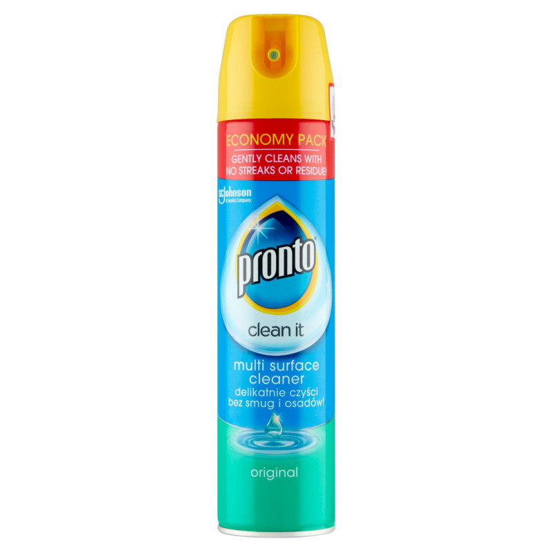 Pronto Multi surface przeciw kurzowi w aerozolu delikatnie czyści większość twardych powierzchni bez uszkodzeń, usuwając kurz i brud bez pozostawiania smug. Odpowiednie do: granitu, kwarcu, chromu, stali nierdzewnej, szkła, luster, zabezpieczonego drewna, laminatu drzewnego, tworzyw sztucznych, elektroniki i innych powierzchni. Usuwa: kurz, odciski palców i smugi.