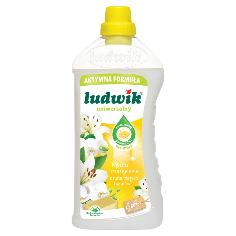 Ludwik płyn uniwersalny z mydłem marsylskim. Uniwersalny płyn do mycia wszystkich zmywalnych powierzchni w całym domu. Skutecznie czyści, nie wymaga spłukiwania, pozostawia długotrwały, przyjemny zapach białych kwiatów.