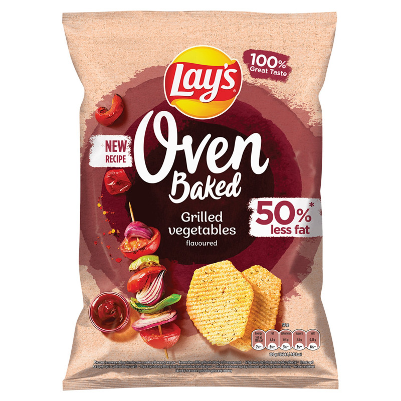 To nie zwykłe chipsy, to Lay’s Oven Baked o smaku grillowanych warzyw! Zanurz się w czystej przyjemności chrupania. Nasze Lay’s Oven Baked są pieczone, a nie smażone, więc zawierają o 50% mniej tłuszczu niż klasyczne smażone chipsy ziemniaczane Lay's, jednocześnie zachwycając pełnią oryginalnego smaku Lay’s.