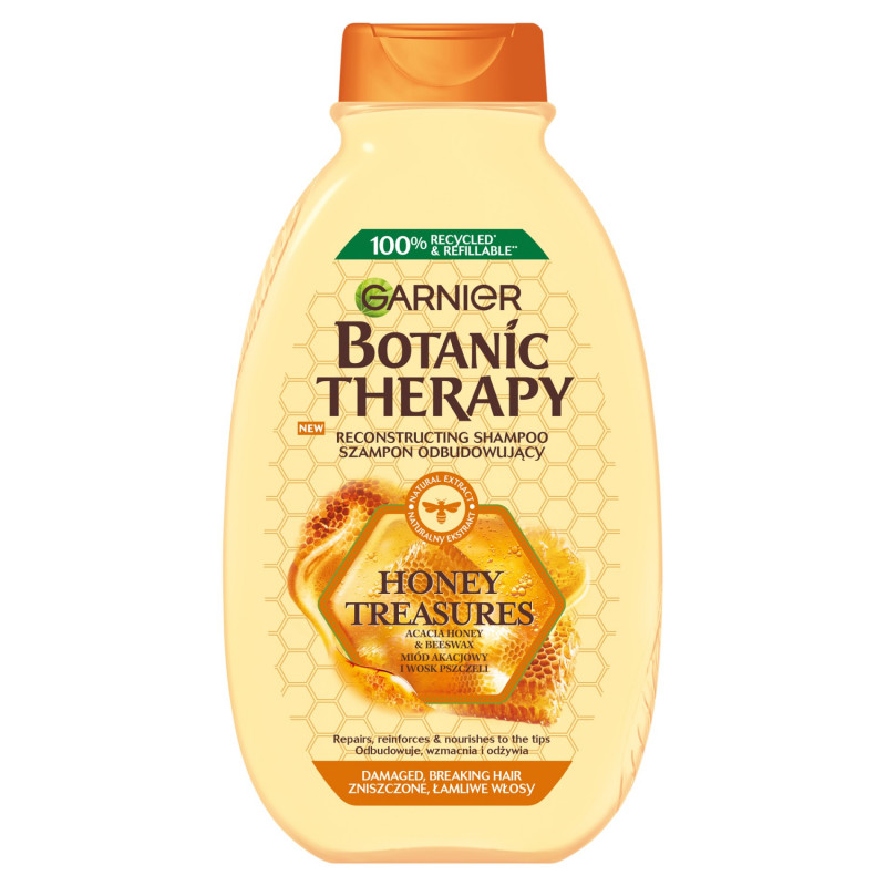 Nasza formuła wzbogacona miodem akacjowym i woskiem pszczelim wypełnia powierzchniowe uszkodzenia, zapobiega łamaniu się włosów i odżywia je aż po same końce.