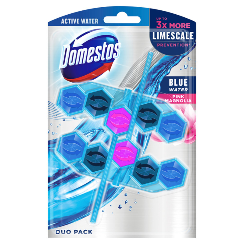 Kostka Toaletowa Domestos Power 5+ aktywna niebieska woda to błyskawiczna w aplikacji ochrona przed osadzającym się kamieniem. Uwalniająca się podczas spłukiwania piana zapobiega powstawaniu osadu i pozostawia na długo świeży, intensywny zapach. Kostki są wyjątkowo wydajne i wystarczają na wiele spłukań. Ale to nie wszystko – dzięki tej kostce, spłukiwana woda w toalecie zmieni kolor na niebieski! Dla wzmocnienia ochrony, kostki należy używać w parze z płynem czyszczącym Domestos - wspólnie tworzą duet, któremu nie oprą się żadne bakterie, wirusy i próbujący osadzić się kamień.