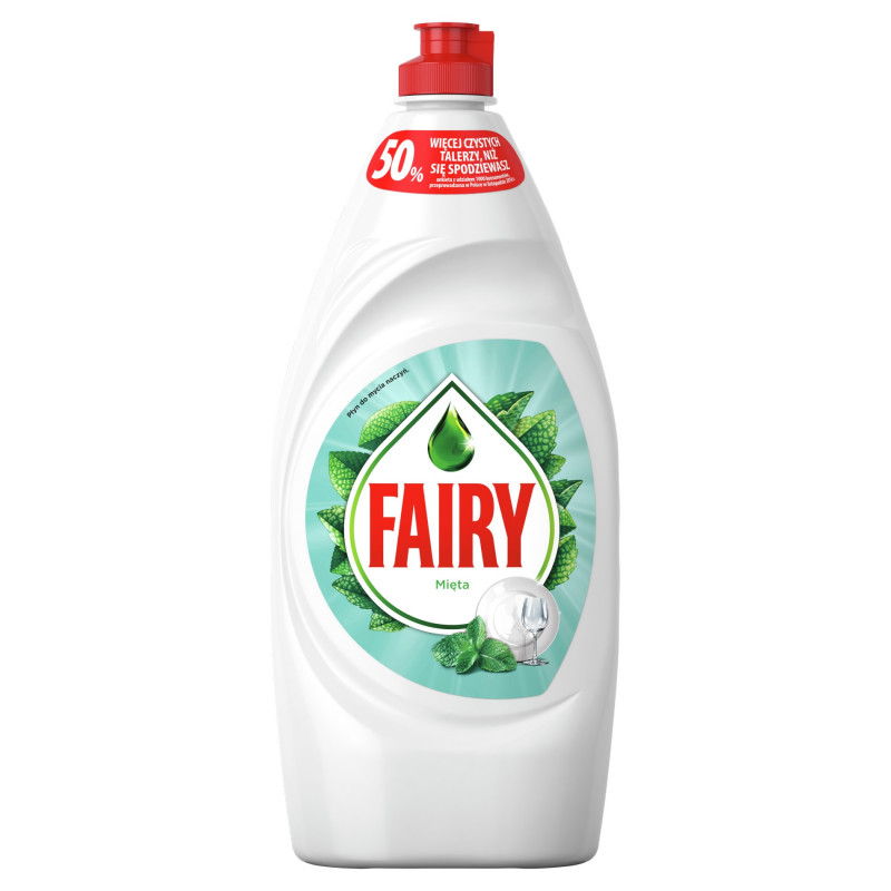 Płyn do mycia naczyń Fairy zapewnia oryginalną moc czyszczenia Fairy i orzeźwiający miętowy zapach.