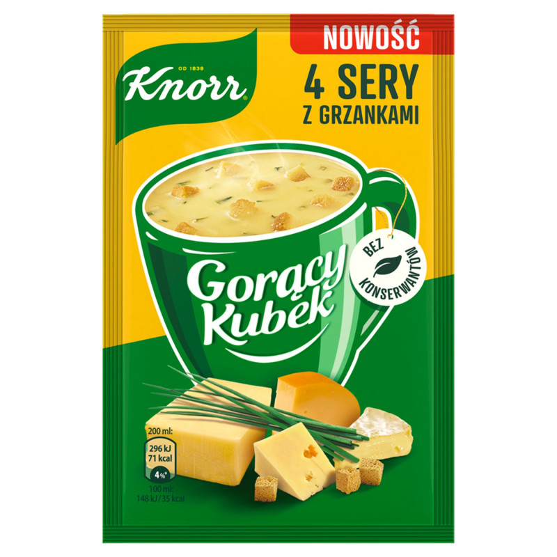 - Gorący Kubek Knorr 4 sery z grzankami to idealny pomysł na pyszną, aromatyczną i szybką zupę zawsze wtedy, gdy nie masz czasu na gotowanie, np. w porze lunchowej