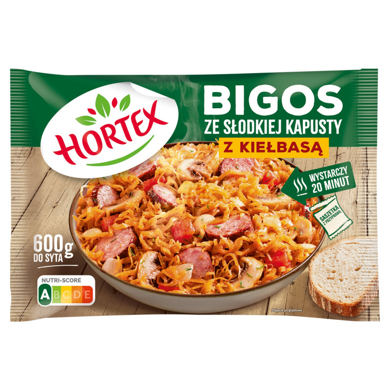 Bigos ze słodkiej kapusty z kiełbasą. Mieszanka warzywna z kiełbasą, pieczarkami, bulionem i przyprawą. Produkt głęboko mrożony.